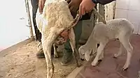 The vaginal prolapse in cattle is usually not as dangerous as some cases of bovine uterine prolapse, and majority of cows with prolapsed vagina are not in the risk of losing their life. When treating cow with a prolapsed vagina one needs to restrain the cow and limit its movement,[1] as well as apply an epidural anesthetic.[2] The prolapsed mass of tissue should then be cleaned with warm water, lubricated and some mild disinfectant should be applied, as these cows are often in the risk of getting an infection.[1][2] In some cases it is useful to empty the cow's bladder right before the procedure.[2] The next step is repositioning the exposed vagina and stitching the tissue around cow's vulva, as the vagina can prolapse again shortly after the incorrect procedure.[1] The stitches must be removed before the next calving.[3]