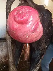 Similar condition that is also connected with a prolapse of cow's reproductive organs, is so-called bovine uterine prolapse, when a uterus gets prolapsed.[4] This usually occurs some hours after calving.[11] The latter condition is much less common in cattle and can be life-threatening in extreme cases.[1][3] The condition requires immediate treatment,[4] which is either reducing the prolapse either amputating the exposed uterus and in severe cases euthanizing the animal,[5] as an untreated cow can die from shock (intensive bleeding) or becomes infertile.[4]
