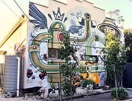 Bowden's new streets are designed to be 'walkable' and shared by vehicles, bicycles and people. With the new development, the suburb is starting to see a lot more pop-up street art[27] and curbless, tree-lined streets furnished with street furniture on footpaths.[28]