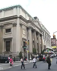 The building's facade is split into two sections: the Bowery elevation and the connected Grand Street and Elizabeth Street elevations.[3] The exterior features Corinthian columns and sculpted pediments by Frederic MacMonnies.[14][5][19] According to Stanford White's descendants, the building's exterior "invoked the authority of ancient Rome" with its design details, including porticos on Bowery and on Grand Street.[20] Wrought iron grilles are also placed in front of numerous windows and doors.[3] The building's basement is clad with a granite water table,[8] while the superstructure is clad with Indiana limestone.[9][10] In addition, the roof is largely covered with Roman tile, except above the banking room, where there is a glass skylight with metal ribs.[8]