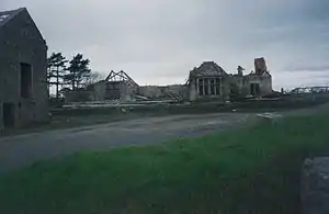 The station buildings are now (2023) in an extreme state of dereliction. A large farm shed covers a portion of the platforms and yard.