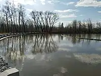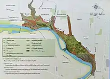 Alongside the ecological restoration, one of the main focuses of the project was stormwater treatment before entering the Bow River.[22] The design includes a Nautilus Pond, a polishing marsh, a wet meadow, a stream, outfall, a dry stream, riparian areas, and a lookout mound.[23][24] The stormwater enters Dale Hodges Park through the Nautilus Pond which is located at the west of the Park. Large sediment particles are removed in the Pond draining system and the water moves slowly through polishing marsh area where wetland plants remove finer particles.[24] A surface stream carries water from the Pond to the marsh. The stream also collects the wet meadow stormwater and "conveys it to the outfall".[24] The lookout knoll is encircled by the marsh with sedge and willows growing nearby.[24]The design for the "sculpted polishing marshes and wet meadows" created by Sans façon, O2 and S2S[22] were inspired by anabranches.[12]: 99 "An anabranch or meander scroll is a section of a river or stream that diverts from the main channel or stem of the watercourse and rejoins the main stem downstream. Local anabranches can be the result of small islands in the watercourse. In larger anabranches, the flow can diverge for a distance of several kilometers before rejoining the main channel."[12]: 99 The 2012 and 2014 reports by O2 Planning + Design Inc noted that the contaminated soil from the gravel pit would be treated with phytoremediation.[12]: 5