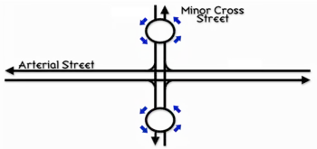 This configuration would reduce delay for the arterial street, increase capacity, and reduce the number of stops required. The primary problem with such a configuration is driver disregard for the left turn prohibition at the main intersection.