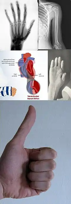 Brachydactyly-long thumb syndrome is a very rare genetic disorder which is characterized by symmetric brachydactyly of the fingers accompanied by an abnormally long thumb, hypomobility of the shoulder and metacarpo-phalangeal joints, and heart conduction defects. Small feet and hands, small shoulders accompanied with short clavicles, clinodactyly, pectus excavatum, mild limb shortening, cardiomegaly, and pulmonic stenosis murmur have also been reported.[1][2] It was first discovered when D W Hollister et al. described 4 affected members belonging to a 3-generation family.[3][4][5] No new cases have been reported since 1981.[6] This disorder is inherited in an autosomal dominant manner.[7]