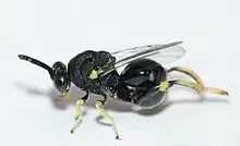 Brachymeria is a genus of parasitic wasps in the family Chalcididae. Over 300 species are known worldwide, all of them parasites of insect pupae.[1] Most species are black with limited yellow markings, and like most chalcidid wasps, they have enlarged hind femora. The female typically lays eggs inside the pupae of a lepidopteran using its ovipositor. Although mostly parasitic on Lepidoptera, a few are hyperparasites (parasites of parasitic Hymenoptera and Diptera), or attack other types of insect larvae (such as Polistes erythrocephalus).[2] The adult parasites emerge typically from the host pupa. Some species have been used in biological control.