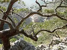 Woodland of Brachystegia tamarindoides subsp. microphylla grows on quartzite outcrops and rocky slopes in the Chimanimani Mountains of Mozambique and Zimbabwe. The trees grow low and spreading, and are draped with tassels of Usnea lichen, with a sparse understory.[1]