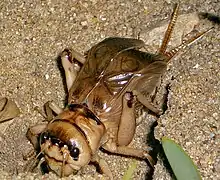 Brachytrupes megacephalus can reach a length of about 40 millimetres (1.6 in). This species is characterized by a very large head (hence the species name megacephalus) and strong jaws. The tibia of the front and rear legs are armed with big teeth which facilitate the action of digging the deep holes in sandy soils in which these crickets live. These insects have crepuscular and nocturnal habits. The mating period extends from mid-March to the end of April. After mating, the males keep the females captive in their holes until they lay their eggs.[3][4][5]