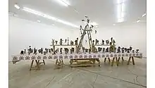 Richard Klein wrote, “Kahlhamer has spoken of Bowery Nation as an “alternative tribe” and the fact that the majority of the work's individual elements were born on New York's Lower East Side (the part of city with the most extensive history of immigration) makes a certain kind of sense” [15] At first glance the installation is over 100-figures, small sculptures on top of a table, deriving from an earlier encounter with a vast collection of Hopi Kachina figures at the Heard Museum. Bowery Nation, (1985–2012) stands as a collective history of material and identity. Each figure created from found objects in an impulsive, spontaneous, and organic manner: “the sculptures were provisional and experimental, with no grand scheme or plan as to their eventual future. There was no attempt to actually replicate specific katsinas, with the nature of the sculptures more reflective of the artist’s hybrid artistic sensibility than Hopi belief or aesthetics”.[15]