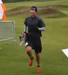 Brad Kearns (born February 4, 1965 in Los Angeles, California) is an American author, podcast host, professional speed golfer, masters high jumper, and former professional triathlete. Kearns performed on the international triathlon circuit from 1986 to 1995 and won 31 events worldwide. He is currently a top-20 world-ranked professional speed golfer, and 2020 top-3 world-ranked masters age 55-59 high jumper. In 2018, Kearns broke the Guinness world record for the fastest single hole of golf ever played (minimum length, 500 yards).