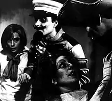 Tobias Haller, Stanley Keyes, Linda Chambers and James Curran in Brad Mays' production of The Water Hen, by Stanislaw Ignacy Witkiewicz, 1983, New York.