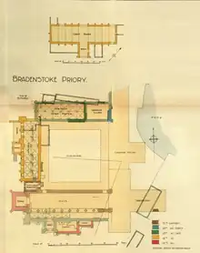 At first it seemed that Bradenstoke Priory would escape the Dissolution of the Monasteries, and the last prior, William Snowe, wrote to Thomas Cromwell thanking him for saving the monastery.[8] However, the priory was suppressed as a religious institution and surrendered by prior Snowe and thirteen canons on 17 January 1539.[2] At about this time, its total income was £270 10s 8d,[9] or at least £212 in 1535.[10] The property then passed from the Crown to a Richard Pexel (or Pecsall) and his heirs sold it to the Methuen family of Corsham.[11] The priory's estate at Wilcot, some 14 miles to the southeast, was bought in 1549 by John Berwick, a member of the Seymour entourage who had previously sat as a Member of Parliament.[12][13]