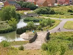 The Woodland area of Bradley Stoke is named Three Brooks Local Nature Reserve, an area of approximately 44 hectares (110 acres)[31] that includes bluebell woods, rough grassland, brooks, ponds, and the man-made Three Brooks Lake. The lake, part of the Frome Valley Relief Sewer,[32] is home to many common species of waterfowl including nesting swans. There are also a number of other walks and paths surrounded by small wooded areas connecting various parts of Bradley Stoke. Wild fruit can be found throughout the woodland, namely blackberries, apples, plums and cherries. A community orchard grows in the heart of the woodland.