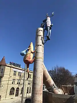 Brady Street Beasts includes a large blue reindeer accompanied by a red rat and a green dragonfly.[2] The sculptures are constructed from sheet metal welded together on top of a substructure of metal rods. The reindeer appears to have scaled to the top of an exhaust chimney above a public works building. Its yellow antlers extend into the sky, and it grasps a paint can from which blue liquid appears to flow into the opening of the chimney. On the opposite side of the chimney, the rat climbs upward. On the roof of the building adjacent to the chimney, a bug-eyed green dragonfly stands with a telescope to its eye. A nearby weather vane includes three words, each painted on a bar with two arrowheads on either end: water, reflection, good food.
