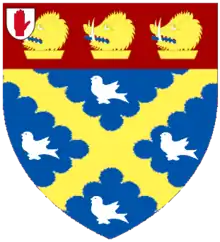 | Arms | A saltire engrailed Or between four martlets argent on a chief gules three dishes each holding a boar's head couped of the second. Confirmed 9 December 1868 by Sir John Bernard Burke, Ulster King of Arms.[3] |