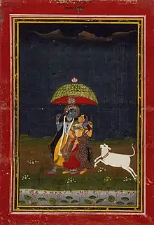 The text's title Brahmavaivarta means "metamorphosis of Brahman", who is identified with Krishna.[4][2] This Purana takes a view on the creation where the Brahman as Krishna creates the universe and is the universe.[25][26] The evolution and the nature of the universe is presented through the legend of Radha and Krishna in this Purana.[27] The seduction stories and legends of this text have attracted many scholarly studies.[28][29]