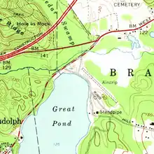 The Braintree Airport was a single dirt landing strip located in Braintree, Massachusetts. The facility was registered with the Massachusetts Aeronautics Commission, originally as a private landing field.[4] Approval to build the airport was sought by Victor H. Heurlin Jr., a Braintree native and World War II veteran who had been trained to fly while in the military. After his service commitment, he returned to Braintree and stayed in the Air National Guard. Along with other aviation enthusiasts, Heurlin formed the Braintree Airport Association in May 1948 and found a suitable parcel of land, owned by the Braintree Water Commission, near the Great Pond. As the town believed that the presence of an airfield would facilitate economic growth, it agreed to lease the land to the association. Subsequently, the association constructed a 1,200-foot-long (370 m) runway that, by 1959, had been extended to 1,400 feet (430 m).[2]