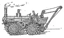 This desire for greater traction in road locomotives (traction engines) probably led directly to the pedrail system which he patented in 1899.[9] In this design the continuously laid tracks contain rollers and the rails roll over them, which gave it the capability for crossing banks and ditches, as well as soft ground; a capability that attracted the attention of the War Office. The practical realisation of this was the Pedrail Tractor made by Fosters of Lincoln, from which an account in 1904 of a trial attended by members of the War Office proved its ability to tow a heavy load over rough ground, climbs hills and turn with ease, and show a 2 ton drawbar pull.[10]