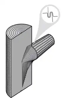 A common malformation of a branch attachment in a tree is the inclusion of bark within the join, commonly referred to as a 'bark inclusion' or 'included bark'. This malformation is known to weaken the connection of the branch to the rest of the tree's structure, as it acts to block the formation of the axillary wood at the branch attachment's apex.[5][6][7]