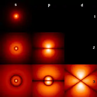 The first few hydrogen atom electron orbitals shown as cross-sections with color-coded probability density