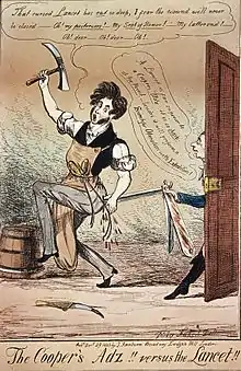 'The Cooper's Adz versus the Lancet' Bransby Blake Cooper being poked in the posterior by a lancet, possibly Thomas Wakley, founder of the medical journal The Lancet.