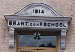The exterior of the building is brick veneer, built on a wood frame. The original roof was wood shingle material, with a brick chimney extending up and over the hip style roof line. Shallow brick arches give the windows a slightly round top, local field stone and mortar are used in the foundation and basement. On the tower, over the school's main entrance is a corrugated tin canopy sign reading: "Brant Cons School 1914"