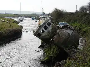 Mr Williams also financed the new quay at Velator, which opened around 1870.[5] The quay was sufficient for ships of up to 130 tons, and continued to be used for unloading gravel until the 1960s.[6] At the same time as the opening of the quay, repairs were required to some of the embankments on the new cut, which were subsiding as a result of the material on which they were constructed. In 1910, the North Devon Coast was hit by severe storms, and the embankments around Horsey Island were breached in several places. A breach also occurred in the walls of the new cut, with local newspapers describing a boat passing through the breach onto the marsh, and back out again when the tide turned, but few other details are known, as contemporary sources were more concerned with the task of repairing the embankments around Horsey Island.[7]