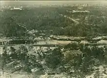 1925 view of Brays Bayou looking north. The forested area is today the Texas Medical Center. Rice University and Memorial Hermann Hospital can be seen at the top left, and Hermann Park can be seen at the top right. Harris Gully, which has been rerouted into an underground culvert, runs from the left side of the photograph into Brays.