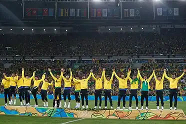 Brazil, managed by senior team coach, Dunga, finished in the first position in the group stage, ahead of Belgium, New Zealand and China, which they beat 1–0, 5–0 and 3–0 respectively.[15] In the second round, Brazil beat Cameroon 2–0 after extra time.[16] Brazil and Argentina met on August 19 in the semi-final game of the competition. The game was marred by numerous fouls and two ejections for Brazil. Argentina won 3–0.[17] In the bronze medal match, Brazil beat Belgium 3–0.[18]