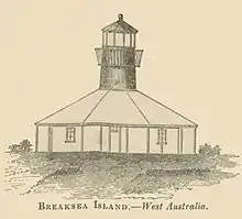 A lighthouse was built on the island in 1858 by English convicts using pre-made cast iron sheeting.[6] This lighthouse was replaced in 1902 by a cylindrical granite tower which remains in generally good condition. However, a major refurbishment taking 21 weeks was undertaken in early 2020, under a contract from the Australian Maritime Safety Authority (AMSA).[7]