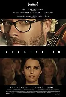 Breathe In is a 2013 American romantic drama film co-written with Ben York Jones and directed by Drake Doremus, starring Guy Pearce, Felicity Jones, and Amy Ryan. It follows a high school music teacher who has an affair with a foreign exchange student from England who is his daughter's age, stemming from his disillusion with life and their shared love of music. It premiered at the Sundance Film Festival on January 19, 2013, the director's third film to play there.[3]