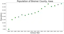 Bremer County(/ˈbriːmər/[1]) is a county in the northeastern part of the U.S. state of Iowa. As of the 2020 Census, the population was 24,988.[2] Its county seat is Waverly.[3] The county was named for Fredrika Bremer, a Swedish feminist writer.[4]