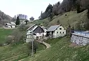 Breznica pod Lubnikom is a village with a clustered core on the south slope of Mount Lubnik (1,025 meters or 3,363 feet).[2] It also included the hamlets and isolated farms of Dolinček, Potočnik, Pri Nacetu, Rohotnik, Zalubnikar, and Žerinc. The Breznica Gorge (Brezniška grapa) lies to the east, the Potočnik Gorge (Potočniška grapa) to the northwest below Pleše Hill (941 meters or 3,087 feet), and the Sopotnik Gorge (Sopotniška grapa) to the west below Hoje Hill (821 meters or 2,694 feet).[2] The village is connected by road to Podpulfrca in the Poljane Sora Valley to the southeast.