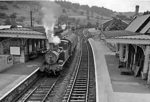 At the eastern end of up platform, a small engine shed with an integral water tower over the entrance was built. This was used by banking engines based at Brimscombe that assisted freight trains up the 1 in 75 Sapperton Bank beyond Chalford. The 1934 GWR locomotive allocation lists 2-6-2T 31xx class no.3171 as based at Brimscombe and in the 1960s this would have been a 2-6-2T of the 51xx or 61xx classes.