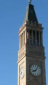 Brisbane City Hall, in Brisbane, Queensland, Australia, is the seat of the Brisbane City Council. It is located adjacent to King George Square, where the rectangular City Hall has its main entrance.[2] The City Hall also has frontages and entrances in both Ann Street and Adelaide Street. The building design is based on a combination of the Roman Pantheon, and St Mark's Campanile in Venice and is considered one of Brisbane's finest buildings.[3] It was listed on the Register of the National Estate in 1978 and on the Queensland Heritage Register in 1992.[4] It is also iconic for its Westminster chimes which sound on the quarter-hour.