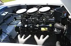 All 406 Zagato models are powered by Bristol's inline six-cylinder gasoline engine. The 2.2-liter version used here (2216 cm³, bore × stroke: 68.69 and 99.64 mm) is a further development of the engine already installed in the 400, which goes back to a 1938 BMW design (328).[25][26] In essential features, the Bristol engine shares the features with the BMW engine; however, Bristol's version is designed in inches rather than metric dimensions, and some of the materials are used differently.[27] The engine has hemispherical combustion chambers with V-shaped hanging valves controlled by the bottom-mounted camshaft via tappets, pushrods, and rocker's arms. Additional pushrods across the cylinder head and a second rocker arm on each actuate the exhaust valves.[27][28] The fuel mixture is conditioned by three 32 PBI/7 Solex downdraft carburetors mounted above the engine block.[22]