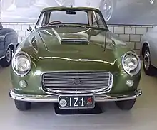 The design of the notchback body can be traced back to Gianni Zagato, the son of the company's founder, Ugo Zagato. The front end of the car features style elements inspired by the Lancia Flaminia Sport, another car designed and built by Zagato.[19][36][37]The radiator grille is directly borrowed from Lancia and, on individual cars even features Lancia's crest encircled by the Bristol Cars emblem.[38] The roof structure follows the trapezoidal shape that gained popularity in Europe in the late 1950s.[39] With the horizontal roofline and the C-pillar set well back, Zagato implemented a Tony Crook specification that the car had to have four full-size seats for adults.[40] However, the interior of the Zagato is tighter than that of the 406 Saloon.[29] The roof is profiled: It has the typical Zagato bulges called double bubbles in the rear.[36][41] On the 1959 prototype and the car produced thereafter, the roof is slightly lower than on the following four cars.[42] The doors are frameless.[17] The front headlights are recessed into the fenders and covered with Plexiglas. Due to the tall engine, a cowl is required in the middle of the hood, which also serves as an air intake.[22][29] A step in the beltline is present above the rear axle, with a higher height at the rear compared to the front. The rear overhang is shorter than that of the standard 406. Consistent with Bristol's tradition, the spare wheel is vertically housed in one of the front fenders in an externally accessible compartment located between the front wheel and the A-pillar. On the other side of the vehicle, a similar compartment accommodates the battery.[11]