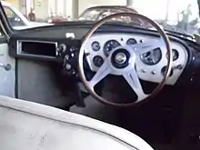 Zagato consistently focused on lightweight construction throughout the design of the 406 Zagato. In contrast to the heavy steel substructure of the 406 Saloon produced by the London coachbuilder Jones Brothers.[45][note 3] Zagato opted for a lightweight frame made of thin steel tubes to which the body panels made of aluminum sheets were attached. The shorter body also contributed to weight reduction. In the interior, Zagato took a minimalistic approach, omitting decorative elements. For example, unlike the factory model, the instrument panel in the 406 Saloon, is not covered with walnut wood; instead, it is made of thin sheet aluminum painted to match the color of the seat covers.[30] However, it is worth noting that at least one car features the comfortable armchairs found in the 406 Saloon.[9]