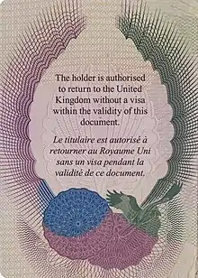 Since the validity of British Certificate of Travel will be identical to the length of stay permitted (their 'leave to remain'), this remark is placed in lieu of the British visa which guarantees the immigration officers at the third country that the document holder will be allowed to travel back to UK and wouldn't become stranded once admitted.[8]