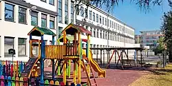 The British International School of Ljubljana is located in Ljubljana's Črnuče District in a repurposed factory building (formerly part of the Elma transformer company).[18] The immediate surroundings include squatters' gardens to the west,[19] the Črnuče Sewage Treatment Plant (Čistilna naprava Črnuče) to the northwest,[20] the Ljubljana Tobacco Company (Tobačna Ljubljana) to the north,[21] and various commercial and industrial buildings to the east. The forested Tomačevo Gravel Bank (Tomačevski prod) lies to the south.[18] The school has recently undergone expansion of its facilities with the addition of a third floor and an outdoor woodland area.[22]