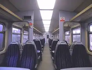 The fleet was part of the "Super Sprinter" build, the other part of which was the Class 156 fleet - though only the latter carried the "Super Sprinter" branding. They were manufactured by British Leyland, who used similar construction techniques to those used on the more basic Pacer railbuses. The relatively lightweight body, which was mounted on a welded floor assembly, comprised a series of pre-formed panels that were fixed together via the extensive use of Avdel rivets. The body is lined with a somewhat large number of windows, which is said to make the coaches appear unusually long; despite considerations towards adopting sealed windows to reduce noise levels, the windows are openable for natural ventilation.[8] It has been observed that, as a byproduct of the vehicle's lightweight construction and length, certain coaches have exhibited a slight, but visible, sag.