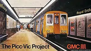 Because of the requirements of operating in the central tunnel section, the initial SELNEC specification for new trains stated that they would require both sliding doors and end connections, which did not feature together on then current rolling stock operated by British Rail.[8] The initial publicity for the Picc-Vic plan, which was described as "Manchester's tube project", showed an artist's impression of a platform with a train resembling the 1967 Stock, as used on the Victoria line in London.[9] However, the twin bore tunnels were intended to be built with a diameter of 18 ft (5.5 m), large enough to accommodate both a main line train type, and the OHLE wires.[note 1][12]