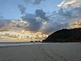 Broken Head is a coastal feature (promontory/headland) and suburb located in the Northern Rivers region of New South Wales, Australia, approximately 9 km south of Cape Byron, the easternmost point of Australia, the closest town being Byron Bay. Immediately adjacent is the 98-hectare (240-acre) Broken Head Nature Reserve which contains an intact segment of littoral rainforest. The suburb of Broken Head contained a population of 225 at the 2011 national census,[2] and in addition supports some tourist accommodation and a campsite. The area is noted for its Aboriginal culture, rainforest walks, whale watching and fishing from pristine beaches,[3] and it is also highly regarded as a surfing locality.[4][5] The Broken Head Holiday Park is currently administered by the indigenous Arakwal people, having been passed to their control by the New South Wales Crown Lands Department in 2009.[6]