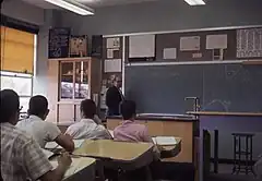 A math and computer programming class at the school in 1960, featuring an IBM 650 op code chart (upper right). Bronx High School of Science was one of the first high schools to teach computer courses. The school had a keypunch machine, students ran their programs at the Watson lab at Columbia University, and the school obtained its own computer, an IBM 1620, a year and a half later.