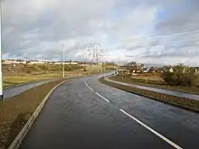 Realigned main road though Broomhouse, with new developments to the south (right) and older housing in Baillieston to the north (left)