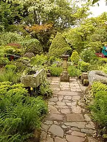 The gardens, which back onto the River Dee, were laid out by Hornel and his sister and cover an area of around 2 acres (0.81 ha). The Japanese garden includes a rockery and a pond with stepping stones, while closer to the river a series of beds are divided by box hedging. A number of 17th-century and 18th-century sundials are sited in the garden, as well as late 17th-century carved stone gate posts.[3]