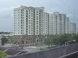 Adjacent to the Brownsville Metrorail station is the construction of a new housing project, "Brownsville Transit Village." The project is composed of 5 mid-rise residential towers (467 apartments) with ground floor retail. The buildings are considered transit-oriented development, and are being designed around the metro station. The project was completed by 2012.[3][4] However, as of 2016, Brownsville and Santa Clara (Santa Clara Apartments TOD), are the lowest ridership stations in the system.[5]