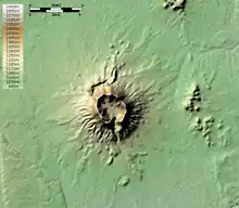 Brukkaros Mountain (Khoekhoe: Geitsi Gubib) is a collapsed caldera in the ǁKaras Region, Namibia. Measuring 1,590 metres at its peak on the eastern edge of the crater, Brukkaros is located about 15 kilometres northeast of the primarily Nama town of Berseba and 100 kilometres north-northwest of Keetmanshoop.[1] It is over 650 metres taller than the surrounding area, but the crater floor is 350 m below the rim.