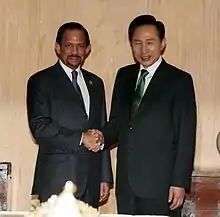 - 1 2 Wi Tack-whan, Limb Jae-un (10 October 2013). "President Park holds summit with Sultan of Brunei". KOREA.net. Retrieved 15 February 2014.