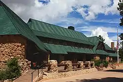 The two-story lodge is built on a stone base with intentionally oversized log framing, creating a massive, rustic appearance. The central portion of the building dates to 1924, with the addition of the north and southeast wings taking place in 1926. The lodge is entered by a long porch fronting the entire lobby, whose roof rests on a 52-foot (16 m) long log beam supported by paired log columns. The lodge is capped by a heavy, steeply-pitched shingled roof with clipped gables and shed dormers.[2][3][4]