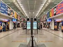 Unlike the other NEL stations, the entrances of Buangkok station do not employ glass in their design; white Teflon sheets supported by metal frames envelop the entrances.[30] The station is designated as a Civil Defence (CD) shelter:[31][32] it is designed to accommodate at least 7,500 people and withstand airstrikes and chemical attacks. Equipment essential for the operations in the CD shelter is mounted on shock absorbers to prevent damage during a bombing. When the electrical supply to the shelter is disrupted, there are backup generators to keep operations going.[33] The shelter has dedicated built-in decontamination chambers and dry toilets with collection bins that will send human waste out of the shelter.[34]